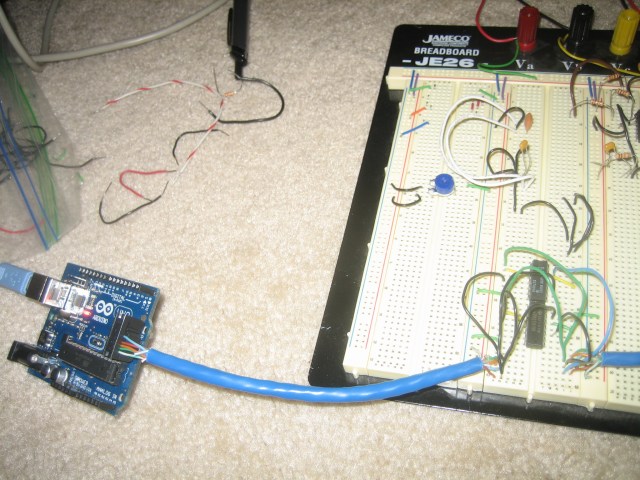 Once the cable was finished I tried out avrdude, which I had been using in my homebrew breadboard AVR programmer. It wasn’t able to find the AVR device on the Arduino board, so I was kind of concerned that I messed up somewhere. I got out my meter and double-checked everything and it all looked fine, so I tried out another programmer. Uisp seemed to work initially: