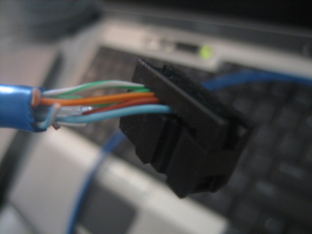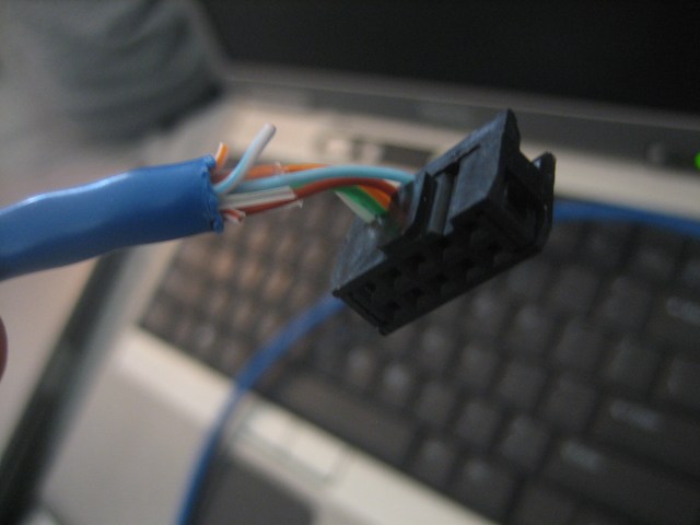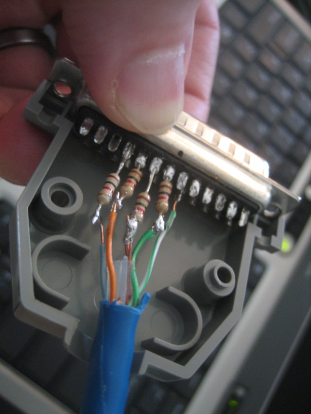 I soldered the 1k resistors directly to the D-sub connector, staggering every other one so that they would be less likely to short out against one another in the shell. I used a bit of cat5 ethernet cabling since I have a lot of it lying around. On the other end I used a DIP IDC (insulation displacement connector) since I’m lazy and I didn’t want to do any more soldering. The cat5 cable is probably at the upper range of wire gauge that will work with an IDC terminator like this, but it worked out. The little pins are probably bent in there though.