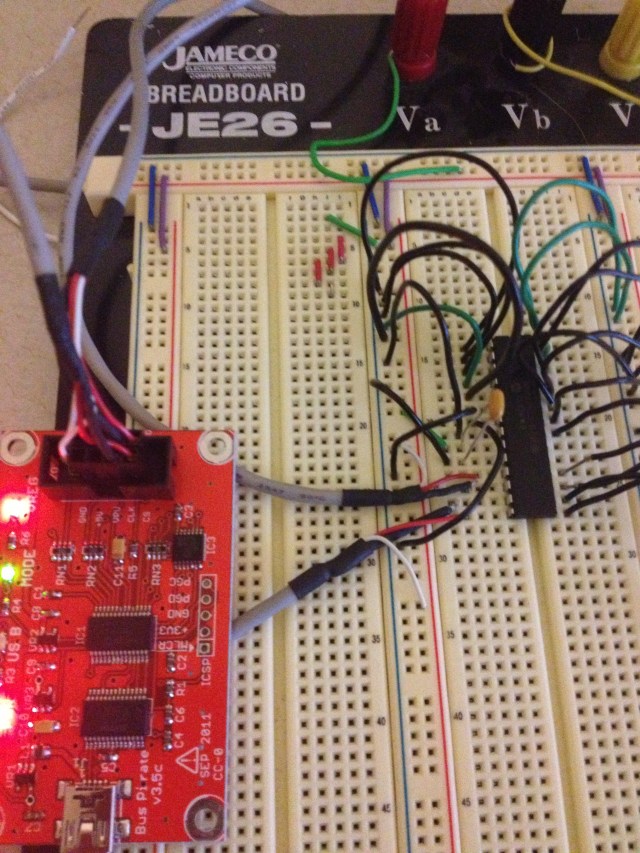 In any case, I wanted to use my Bus Pirate to play around with my samples. The Bus Pirate can be configured to twiddle around with just about any device that speaks I2C or SPI (among other things), but that flexibility comes at the cost of some simplicity in setting things up. If you know what you are doing it actually is pretty simple, but I had to figure out a few things before I had things working.