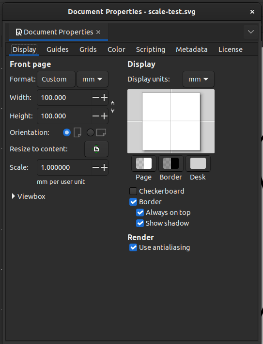 The critical detail here is the “resize to content” and the scale factor. For my system the scale factor was 0.26 approximately. It seems to be automatically calculated by Inkscape and seems to work. The default unit seems to be the pixel.