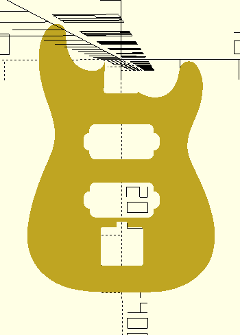 This is what the template looks like when applied to a random Strat outline that I downloaded. It’s parametric so I can specify where each component goes on the center line, but I’m still looking into how to automatically figure out where the neck pocket and bridge position need to go based on the scale length and the neck. One template I found marked the position of the 21st fret so maybe that’s common in the luthier world. Ideally I’d like to take a random outline, establish a centerline and be able to play with positioning in a way that will always produce a playable instrument. I need to figure out a critical measurement for a given neck that I might buy so that the scale length works out. I was a little perplexed the first time I bought a neck and it didn’t have any holes drilled in it. So it’s a design decision how deep in to set the neck really and even where to drill it.