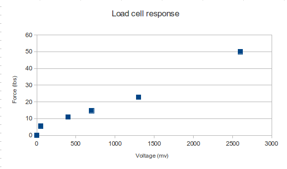 I took a few measurements to see what the response curve looked like. The values jump around a bit even with very constant pressures, so these readings are kind of rough averages of what I was seeing on the DMM. The load numbers are pretty accurate, since I was taking those readings from the postal scale. Here is the graph: