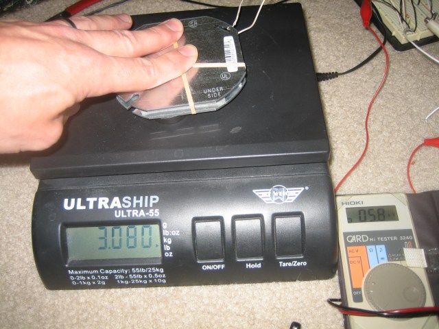 Now to find out how well it works. My test setup consists of a postal scale and a digital multimeter. I have the load cell connected in a resistive voltage divider network along with a 10K resistor. Loading the cell pulls the output up toward a 5V supply. Here is what the test setup looks like: