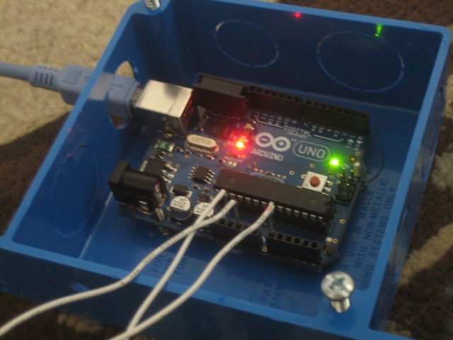I’m mounting the Arduino inside a plastic junction box. Check out the following photo: