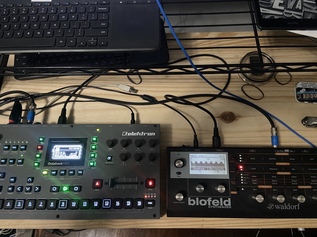 I’m still jamming on my Octatrack today. I hooked up my Waldorf Blofeld to the mix. Same kind of setup where I have MIDI going out of the OT and into the Blofeld.