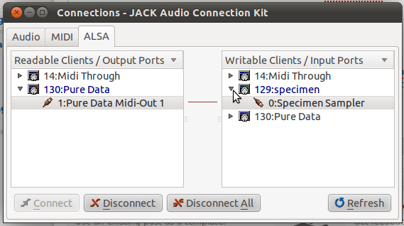 Once PD is running, select ALSA Midi as the output system in PD. This should cause PDs Midi output to appeaer in the Jack connection manager: