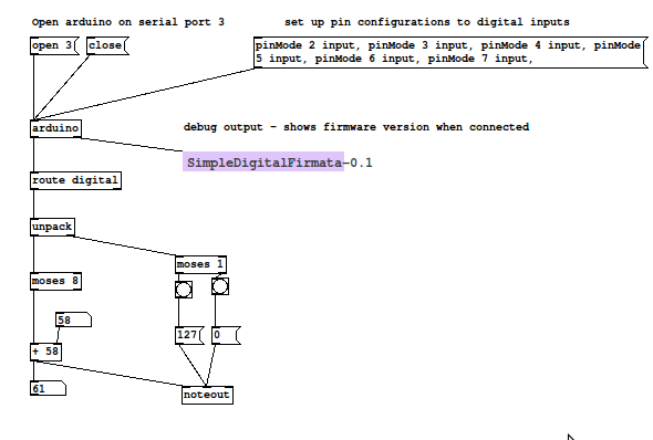 You can also make this change in the Firmata shared library code as outlined here, although I chose to make my changes locally in the sketch. Note that setting up the Arduino to use pull up resistors means that everything will be inverted from most of the Firmata examples you will find on the Web. We are using PD so it is trivial to invert the signals so this is really not an issue at all, just something to keep in mind when debugging. To reiterate, when we hit a button the Firmata object in PD will go low rather than high. The steady state when a button is not depressed will be high.