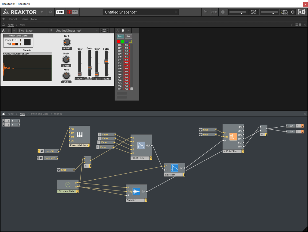 Anyway on to this. I’m treating Reaktor as a problem solving tool. Sort of like Max 4 Live maybe. Here is a screenshot: