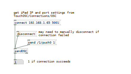 I initially had the wrong IP address set up, and for some reason when you send the connect message without first disconnecting, PD won’t reconnect to a new IP address. I added a disconnect message to the patch like this: