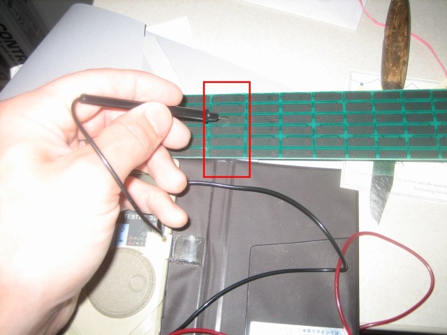 The procedure for testing once the fretboard has been removed from the guitar is to connect one meter lead to the common wire for the fret and then probe the six fret contacts to see if they are good. Note that since there are diodes involved, we have to have the meter connected in the correct orientation. The red DMM lead should be connected to the common wire for the fret.
